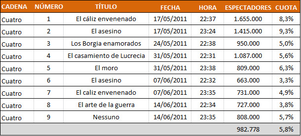 'Los Borgia' se despidió este martes del prime time de Cuatro con un doble episodio que dio por finalizada la primera temporada de la ficción. Los datos, aunque no han sido tan positivos como otras ficciones emitidas en los últimos meses como 'Spartacus', han mantenido una media del 5,8% con 982.000 espectadores de media.