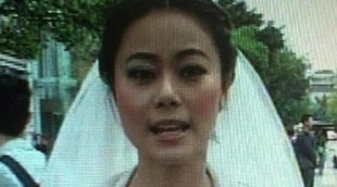 Una reportera china cubre la noticia de un terremoto vestida de novia