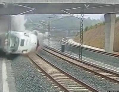 Imágenes del instante exacto en el que el tren con trayecto Madrid-Ferrol descarrila nada más entrar en la curva. Al parecer, el tren circulaba a más de la velocidad permitida que en la zona era de 80km/h.