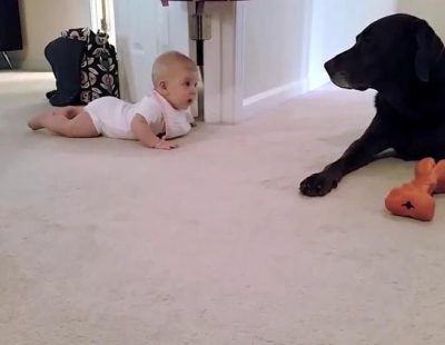Los primeros gateos de un bebé para llegar a su perro con final feliz