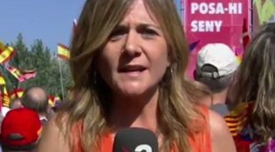 La reportera estaba cubriendo la manifestación en Barcelona a favor de la unidad de España, cuando uno de los manifestantes le golpeó en la cara con su bandera española.