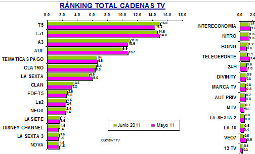 Telecinco (15%) sube 0,7 puntos y arrebata el liderazgo a La1 tras diez meses consecutivos. La cadena lidera entre las mujeres, los jóvenes de 13 a 24 años, los adultos jóvenes de 25 a 44 años y el "target comercial", así como entre los ámbitos de Andalucía, Canarias, País Vasco y Valencia. Es el canal más visto de miércoles a sábado y en las franjas de mañana, tarde y noche 2 (24.00 – 26.30 h.). Sus ganancias con respecto al mes pasado se dan en todos los target y, sobre todo, en la jornada de los sábados y en la bandas horaria de mañana. Las galas de los jueves de 'Supervivientes' copan los primeros puestos de emisiones más vistas de la cadena en junio, junto con la ficción de 'La que se avecina'.