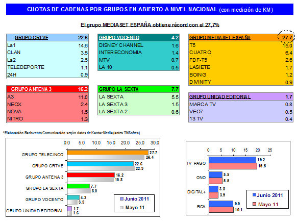 Es el mes de junio que registra un mayor consumo televisivo de la historia. Cada español ha pasado viendo televisión una media diaria de 232 minutos, 8 menos que en el mes pasado, y 2 minutos más que en junio del 2010.