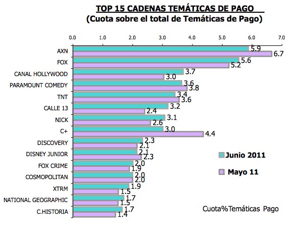 La suma de las cerca de 80 Cadenas Temáticas de Pago, (6,5%) baja una décima en junio. Lideran en la franja de madrugada (02.30 – 07.00 h.). El ranking de cadenas lo encabeza Axn (0,4%), seguida de Fox (0,4%), Canal Hollywood (0,2%) y Paramount Comedy (0,2%).