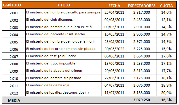 En su última entrega (11 julio), el capítulo "El misterio de los diez desconocidos" marcó un récord histórico de cuota, 20%, y sumó 3.188.000 espectadores. Fue el programa más visto del día - el único que superó los 3 millones de espectadores- y lideró el horario de máxima audiencia. Con la emisión de este lunes la ficción de La 1 lleva nueve semanas consecutivas como líder del horario estelar de los lunes.
