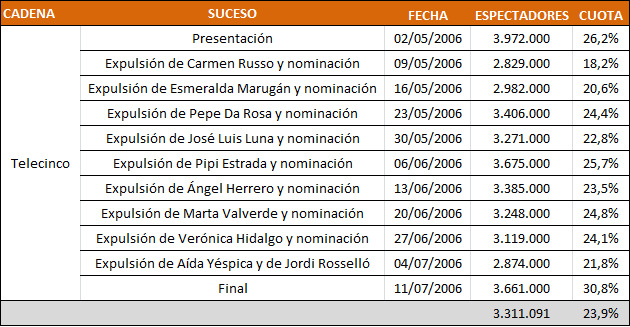 El programa fue líder en ocho de las once galas emitidas aquel año. Logró unas muy buenas audiencias que se coronaron con el 30,8% de la final emitida el 11 de julio de 2006. 3.661.000 espectadores fueron testigos de cómo Carmen Russo se imponía a los dos exconcursantes de 'Operación Triunfo'.