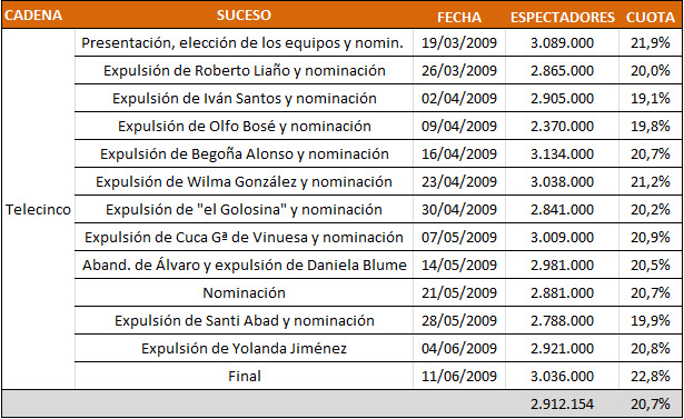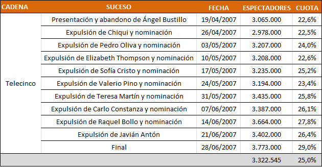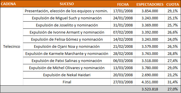 Un 27% de media siguió esta edición del formato de Magnolia. La gala menos vista coincidió con la expulsión de Nekal con un 23,2% de share y 2.690.000 espectadores mietras que la final llegó hasta el 31,4% de share con 4.351.000 seguidores.