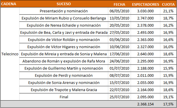 La media del reality se vio de nuevo resentida con un descenso de nuevo provocado por la fragmentación, y probablemente también a un desgaste del formato. 'Supervivientes 2010' se cerró con un 17,5% de share y 2.368.000 espectadores.