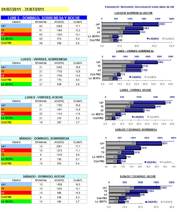 Como segunda opción, se coloca Telecinco. Le distancia del liderazgo una media de 566.000 espectadores. Antena 3 se coloca como segunda opción aunque solo si se tiene en cuenta las sobremesas de los fines de semana, ya que en días laborables es tercera. laSexta supera a [/i]https://www.formulatv.com/cuatro/[i]Cuatro[/i] con una diferencia de 13.000 espectadores.
