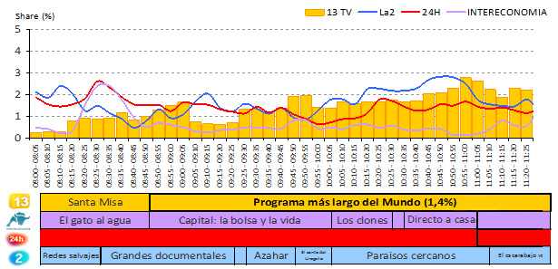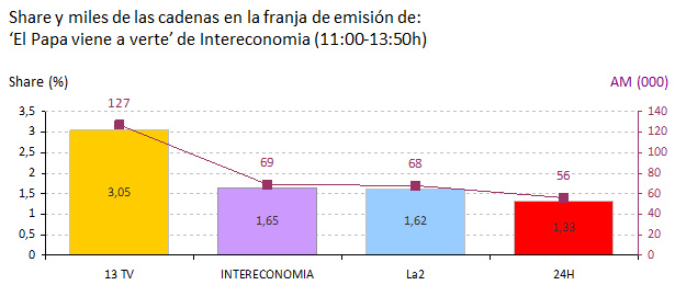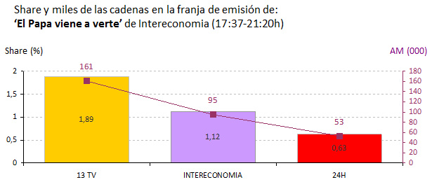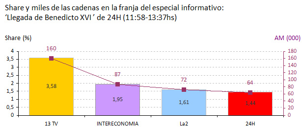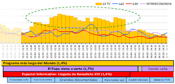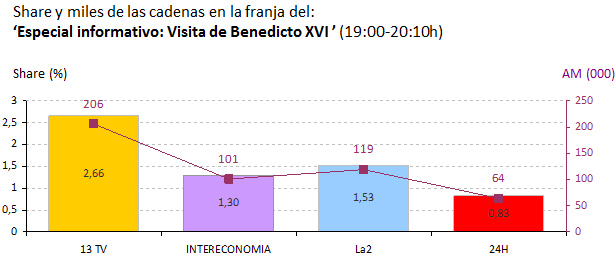 Tal y como puede verse en las tablas inferiores, 13tv superó a Intereconomía y al canal 24 Horas de TVE con la llegada a Barajas de Benedicto XVI y su traslado hasta la Nunciatura del Vaticano en España. La cadena logró colocarse por encima de estas cadenas desde media mañana y hasta las 13:30 horas.