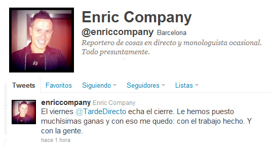 El próximo viernes, 23 de septiembre, 'Tarde directo' dirá adiós a los espectadores. Las audiencias que durante las últimas semanas viene cosechando el formato no terminan de convencer a los directivos de laSexta. A pesar de que algunas voces abogaban por mantenerlo en parrilla, su alto coste ha obligado finalmente a cancelar su emisión. Así las cosas, el programa -heredero del veterano 'España directo' (La 1)- se despedirá de la audiencia este viernes, tal y como ha anunciado Enric Company, reportero del programa, en su Twitter.