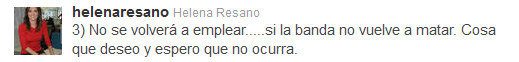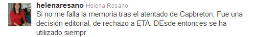 Tras esta aclaración, Helena Resano asegura que su uso en los informativos de este martes se debió a un error y no a una decisión editorial. La presentadora aclara que la cadena no tiene intención de volver a utilizarlo en sus informaciones siempre y cuando ETA no vuelva a matar.