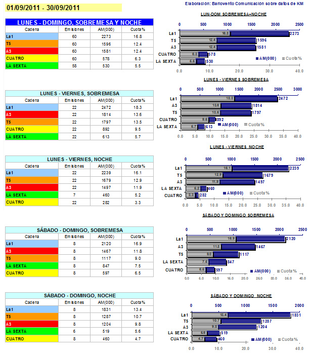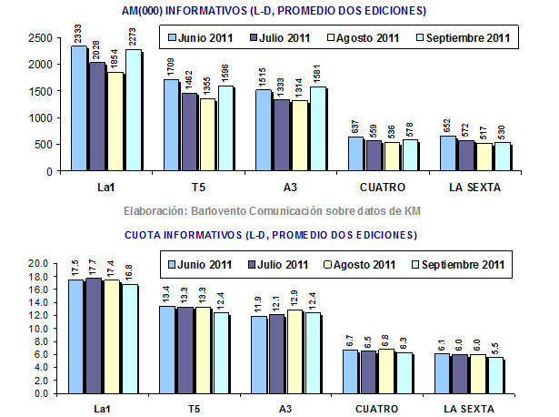 Por otro lado, Cuatro recupera en septiembre la cuarta posición en la ponderación de las dos ediciones y supera a laSexta con una diferencia de 48.000 espectadores. Cuatro promedia un 6,3% (578.000) frente al 5,5% (530.000) que anota su rival más directo.