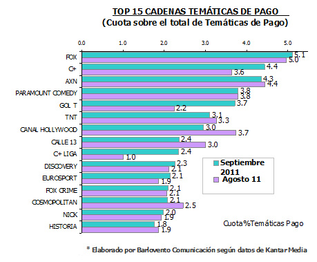 La suma de las cerca de 80 cadenas Temáticas de Pago (6,7%) baja dos décimas en septiembre. Pierden el liderazgo de la franja de madrugada a favor de Clan. Las cadenas de pago de mayor audiencia este mes son FOX (0,3%), C+ (0,3%), AXN (0,3%), Paramount Comedy (0,3%) y Gol T (0,3%).