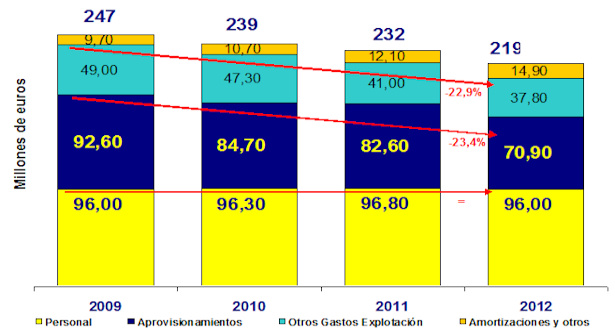 El presupuesto de gastos será de 219.661.529 euros. 12,7 millones de euros menos que en 2011. Dentro de la partida de gastos la más importante es la de personal, que ha pasado de representar el 37,8% del total de gastos a ser el 43,8% en 2012.