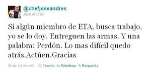 El chef español José Andrés ('Vamos a cocinar', 'Made in Spain', TVE) ha colgado un singular y seguramente polémico anuncio en Twitter en el que ofrece empleo a los miembros de ETA que renuncien a la violencia y que pidan perdón. Esta ha sido la reacción del popular y prestigioso cocinero tras conocer el cede indefinido de la actividad armada de la banda.