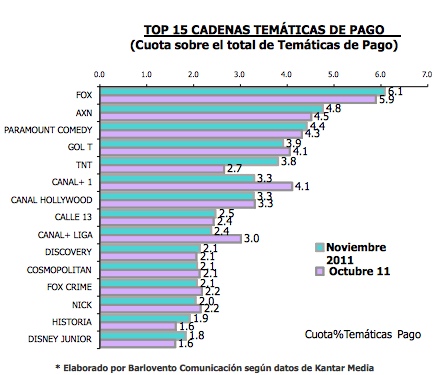 El conjunto de las Cadenas Temáticas de Pago (6,4%) bajan cuatro décimas en el mes de noviembre, con un descenso generalizado en los diferentes grupos cualitativos, si bien destacan las bajadas en hombres y los mayores de 64 años. El grupo de Pago está encabezado por Fox (0,4%), AXN (0,3%), Paramount Comedy (0,3%), GolT (0,3%) y Canal+1 (0,2%).