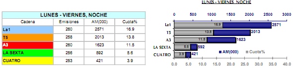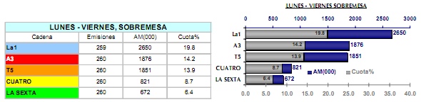 Analizando las sobremesas de lunes a viernes se producen ciertos cambios en el orden de los informativos. Antena 3 adelanta a Telecinco en la segunda posición, la primera en el ámbito privado. Cuatro se coloca en cuarta posición desbancando a laSexta. En cuanto a los informativos diarios nocturnos el ranking es igual al ranking total, con los de La 1 liderando, seguidos de Telecinco, Antena 3, laSexta y Cuatro.