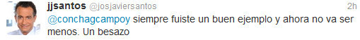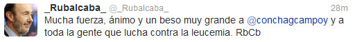 Uno de los casos que más ha sorprendido ha sido el de Alfredo Pérez Rubalcaba. El candidato a las primarias del PSOE, que competirá con Carme Chacón por el liderazgo del partido en el mes de febrero, se ha solidarizado con Concha García Campoy mandándole "mucha fuerza, ánimo y un beso muy grande" a ella y a toda la gente que lucha contra la leucemia.