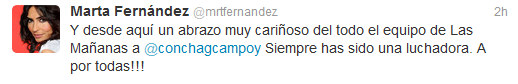 Una de las caras que más ha gustado a Concha García Campoy ver que la apoyaban ha sido sin duda la de Marta Fernández. La presentadora le ha mandado un "abrazo muy cariñoso" de parte del equipo de 'Las mañanas de Cuatro', programa en el que la sustituyó hace ahora un año. "Siempre has sido una luchadora. ¡A por todas!".