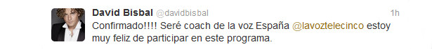 Como ya adelantó en exclusiva FórmulaTV.com, David Bisbal será uno de los integrantes del equipo de coaches de 'La Voz'. Telecinco y el propio Bisbal lo han confirmado este viernes. Como ya se sabía, Jesús Vázquez se pondrá tras el verano al frente de este concurso basado en el formato de éxito internacional 'The Voice'.