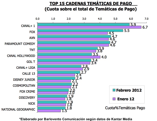 El conjunto de las Cadenas Temáticas de Pago (6,6%) bajan siete décimas después de dos meses consecutivos de crecimiento. Lideran en la franja de madrugada (02:30 – 07:00 horas). Sufren pérdidas en todos los target, pero sobre todo en hombres y en menores de 64 años. El grupo de Pago está encabezado por Canal+1 (0,4%), Fox (0,4%), AXN (0,3%), Paramount Comedy (0,3%) y Canal Hollywood (0,2%).