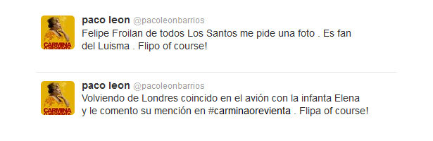 Paco León, actor que interpreta a Luisma en la conocida ficción, ha contado a través de su cuenta personal de Twitter un inesperado encuentro con la Infanta Elena y su hijo. "Volviendo de Londres coincido en el avión con la infanta Elena y le comento su mención en "Carmina o revienta", asegura.