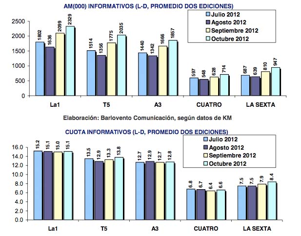 Telecinco ocupa la segunda posición informativa en las dos ediciones de las jornadas laborables y en la noche de fines de semana. La cadena de Mediaset crece medio punto y pasa del 13,3% de septiembre (1.775.000) al 13,8% de octubre (2.05.000).