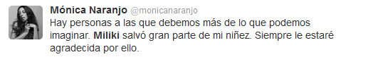 Mónica Naranjo también quiso ensalzar la figura de este mítico payaso y aseguró que "hay personas a las que debemos más de lo que podemos imaginar". "Miliki salvó gran parte de mi niñez. Siempre le estaré agradecida por ello". En la misma línea se mostró Florentino Fernández, que afirmó que era un día triste y Miliki se iba pero a cambio dejaba momentos para agradecer de corazón lo enseñado.