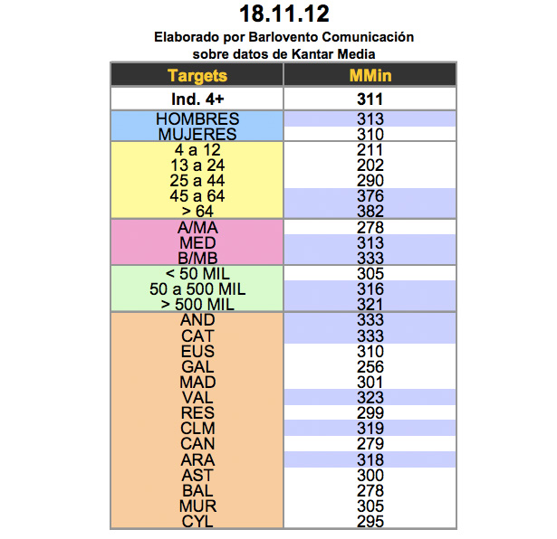 Los target que más tiempo pasaron frente al televisor fueron los hombres, los maduros de 45 a 64 años y los mayores de 64 años, los televidentes de clases medias y bajas/medias, así como los residentes en núcleos poblacionales medios y grandes urbes. Por ámbitos, los que más televisión consumieron en orden de consumo fueron: Andalucía, Catalunya, Comunidad Valenciana, Castilla La Mancha y Aragón.