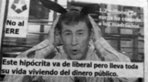 No obstante, los carteles protagonizados por Sánchez Dragó y Cristina Tárrega continúan a la altura del anterior. A través de una fotografía del escritor con dos orejas de conejo el cartel destaca: ''Este hipócrita va de liberal pero lleva toda su vida viviendo del dinero público. 1,2 millones de euros ha costado a los madrileños''.