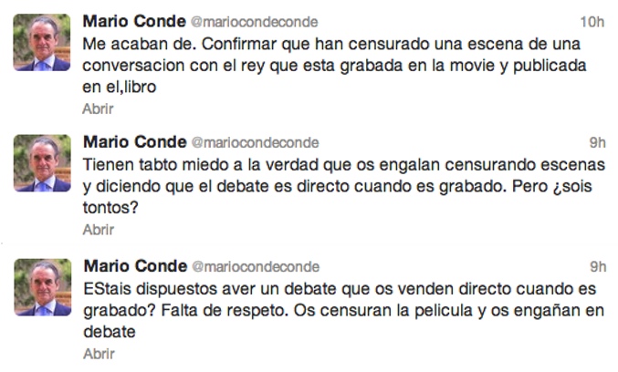 Mario Conde agitó las redes sociales este jueves con sus comentarios sobre el desenlace de la TV Movie que ha emitido Telecinco acerca de su vida. Según afirmó en Twitter, Mediaset España ha censurado una de las escenas en la que el propio exempresario recibía una llamada del rey y es advertido de que van a intervenir Banesto. "Me acaban de confirmar que han censurado una escena de una conversación con el rey que está grabada en la TV Movie y publicado en el libro".