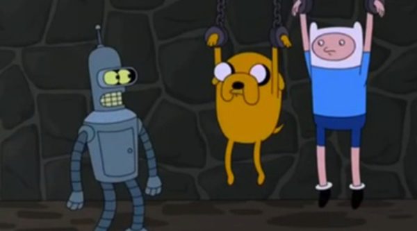 En ese corto encuentro en 'Futurama', Finn y Jake están prisioneros cuando se encuentran con Bender. Los protagonistas de 'Hora de aventuras' le preguntan al robot: "What time is it? (¿Qué hora es?)"; y este responde con uno de sus habituales improperios: "Es hora de que te calles". Cabe señalar para los espectadores que no conozcan 'Hora de aventuras', que cada episodio comienza con esa pregunta que se responde con un simple: "Es 'Hora de aventuras'".