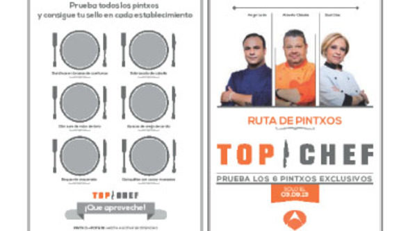 El próximo martes de 3 septiembre, en el Festival de Televisión de Vitoria (FesTVal), Antena 3 presentará su gran apuesta de la temporada, 'Top Chef', por ello la cadena ha aprovechado para crear la "Ruta de Pintxos Top Chef", un recorrido por diversos bares que ofrecerán seis pintxos diseñados en exclusiva por los prestigiosos cocineros Alberto Chicote, Ángel León y Susi Díaz.