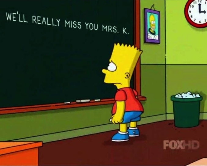 Debido a ello, en el capítulo de estreno emitido este domingo, 3 de noviembre, en la cadena estadounidense Fox, Bart Simpson hace un guiño a Edna en el gag de la pizarra, en la cabecera de la serie. En este episodio, el alumno de Edna escribe en el encerado: "Te echaremos mucho de menos, señorita Krabappel".