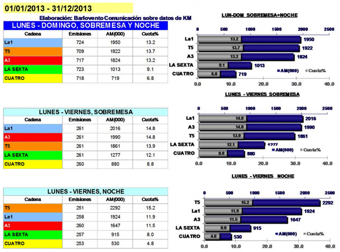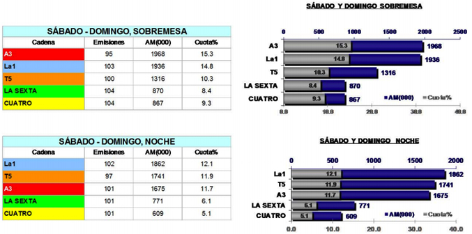 Tanto la cadena pública como la principal cadena de Atresmedia TV promedian un 14,8% en la sobremesa, aunque en número de espectadores La 1 supera a la cadena privada al reunir a una media de 2.016.000 espectadores frente a los 1.990.000 de Antena 3. En la noche de lunes a viernes, Telecinco es la clara vencedora al promediar un 15,2% y reunir a una media de 2.292.000 personas.