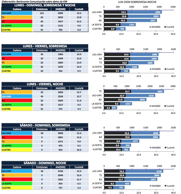 TVE consigue liderar las ediciones de sobremesa todos los días de la semana y las noches de los sábados y domingos con la emisión del 'Telediario' a través de La 1 y el canal 24 horas con un 13,3% y 2.096.000 espectadores. Sólo Telecinco supera a TVE de lunes a viernes en la edición nocturna de los informativos con un 15,7% y 2.606.000 espectadores.