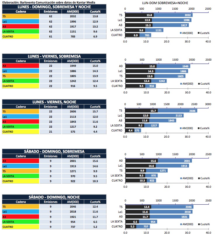 De lunes a domingo, laSexta (9,6% y 1.151.000) supera a Cuatro (6,9% y 783.000) en 2,7 puntos y 368.000 espectadores en la ponderación de mediodía y noche. Los informativos de la cadena verde crecen 4 décimas de share y 17.000 espectadores. Similar resultado obtiene Cuatro, que gana 3 décimas y 20.000 espectadores.
