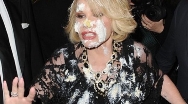 Desde septiembre del 2010 Rivers, que tiene 80 años, lidera semanalmente el programa 'Fashion Police' y lo hace acompañada de otros conductores. Juntos critican la vestimenta usada por las celebridades en eventos públicos. Pues bien, parece ser que a alguien no le han sentado muy bien sus críticas. Momentos después de la primera fotografía esta era la cara de Joan Rivers, completamente embadurnada de tarta.