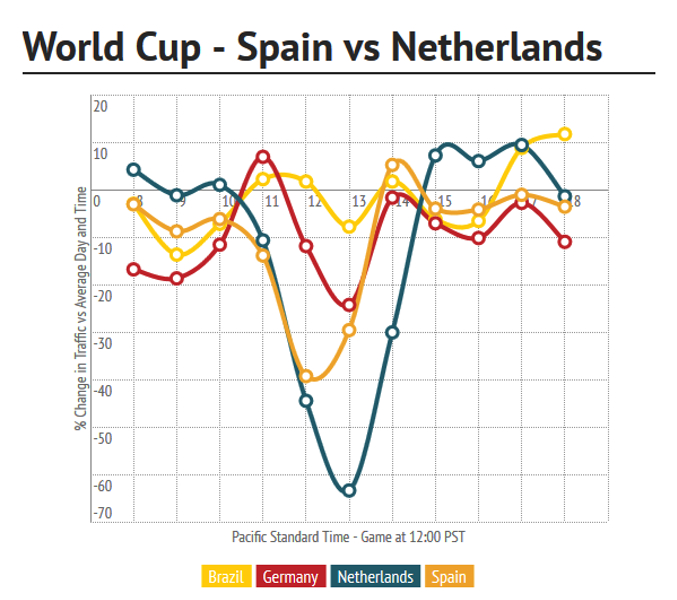 En cuanto a los resultados en este país, son destacables los datos recopilados durante el partido de España contra Holanda, que finalizó con un resultado nada positivo para La Roja (5-1). En el tiempo que duró el encuentro, las conexiones con YouPorn disminuyeron un 40% en España, cifra que se elevó hasta el 65% en el caso de Holanda.