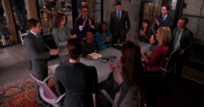 El actual fiscal del estado y Alicia tienen bastante con la guerra abierta por la detención de su socio en la que la fiscalía parece estar demasiado motivada. Éste parece que será un aliciente suficiente para que la idea de ser fiscal pase por la cabeza de la abogada, aunque sea por un solo segundo, como muestra la mueca que hace en el ascensor y posterior negación con la cabeza, y por venganza.