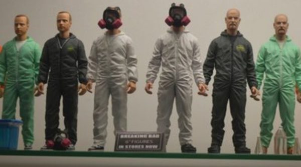 Por un precio bastante asequible, los seguidores de la serie pueden adquirir estas figuras en miniatura de los dos principales protagonistas de la serie de AMC. Existen varios modelos de los muñecos y, por ejemplo, uno de Walter White va acompañado de una mochila para llevar dinero y una diminuta bolsa que simula la droga. Por su parte, su compañero Jesse Pinkman va vestido con un mono blanco y una mascara antigás.