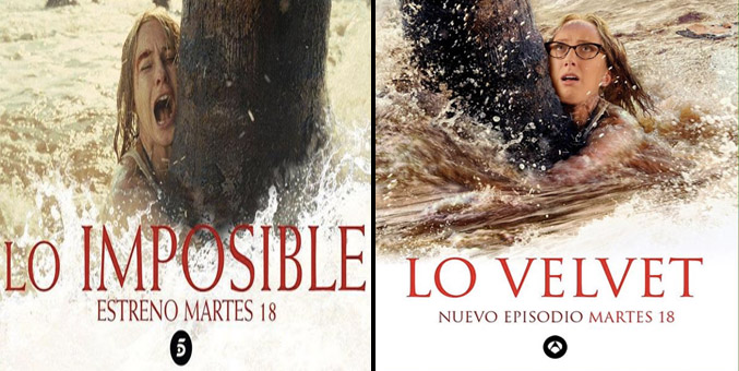 Utilizando una de las imágenes promocionales de "Lo imposible", el fotomontaje sustituye la desgarradora imagen de Naomi Watts y coloca en su lugar a Cecilia Freire, Rita en la serie 'Velvet' de Antena 3. Por su lado, el título "Lo imposible" ha sido modificado por "Lo Velvet", utilizando para ello la misma caligrafía de la película. La imagen colgada por el productor de la serie viene a calcar la imagen que Mediaset España ha lanzado para promocionar su película en las redes sociales.
