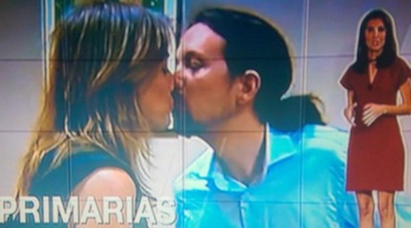 El hecho ha ocurrido durante la primera edición del 'Telenoticias Fin de Semana' del 30 de noviembre, mientras una de las presentadoras, Pilar G. Almendral, repasaba las noticias del día. Al abordar el proceso de primarias que vive el partido en Madrid, en la pantalla que la conductora tenía detrás salían ambos políticos besándose.