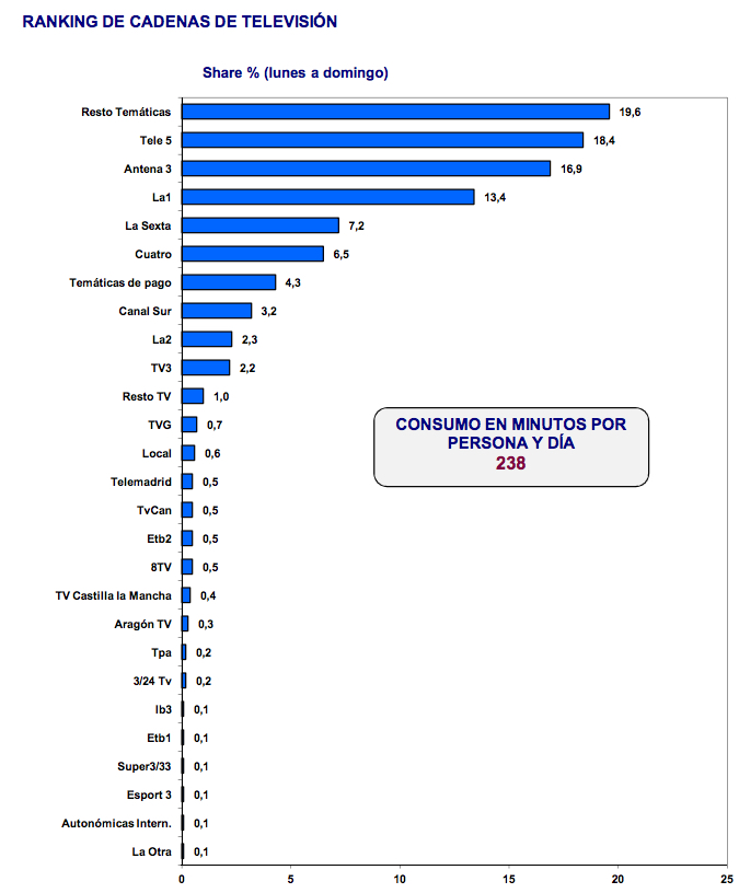 laSexta, por su parte, vuelve a imponerse a Cuatro, aunque ambas crecen respecto al anterior estudio. Del 6,6% y 6,1% de la anterior oleada, han pasado a registran un buen 7,2% y un 6,5% de share medio en esta ocasión.
