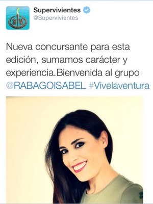 Isabel Rábago será la octava concursante de 'Supervivientes'. La colaboradora de televisión a quien actualmente se puede ver en el magacín de Antena 3 'Espejo público' ha confirmado a través de su blog personal que se suma al reality de Telecinco. Una noticia que ya había avanzado en exclusiva Miguel Frigenti en FormulaTV.com.