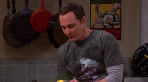 En la cocina, Rajesh le dice a Howard que se deja mangonear por Bernadette. Envalentonado, Howard decide que sólo hará tareas "masculinas" como sacar la basura (que alguien me explique eso de que las tareas de casa tienen género). El astronauta saca la bolsa de basura del cubo y se rompe, dejando la cocina aún más sucia.