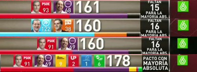 El espectador que este domingo optó por informarse a través de laSexta tuvo en todo momento la mayor información posible de los resultados escrutados hasta el momento. A la izquierda de la pantalla la cadena fijó el número de escaños que los partidos iban logrando a medida que avanzaba el recuento, en la parte superior fueron apareciendo los resultados por provincias, mientras que en la parte inferior se alternaban las declaraciones de los partidos políticos con las combinaciones de "El pactómetro" de Ferreras.