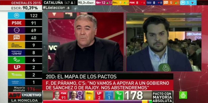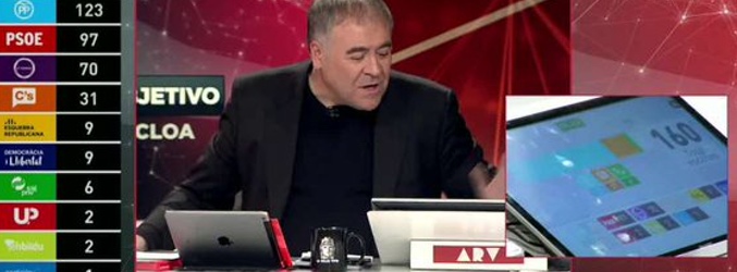 laSexta sorprendió este domingo, 20 de diciembre, con "El pactómetro", una singular calculadora en manos de Antonio García Ferreras que hacía el cálculo y mostraba al instante la suma de escaños necesarios para alcanzar la mayoría absoluta en el Congreso. Una vez cerrados los colegios electorales, 'ARV: Objetivo La Moncloa' se sacó de la manga este singular "aparatejo" que daba al presentador la posibilidad de realizar en directo y de forma visual la suma de escaños que hasta ese momento tenían los distintos partidos. Como si de un videojuego se tratase, el objetivo era alcanzar los 176 escaños que suponen la mayoría en la Cámara Baja.