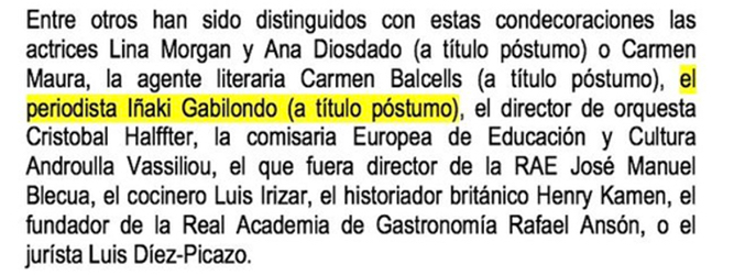 El periodista Iñaki Gabilondo ha aparecido en un comunicado emitido por el Ministerio de Cultura donde figuraban los ganadores de las medallas de la Orden Civil de Alfonso X el Sabio, en cuya lista aparecía el periodista pero "a título póstumo" junto a otras figuras ilustres de la cultura, tal y como ha informado eldiario.es